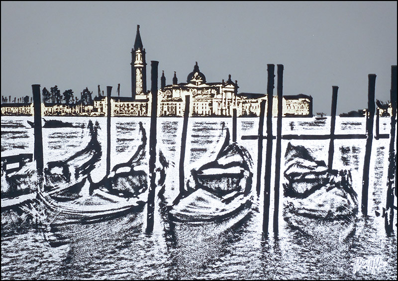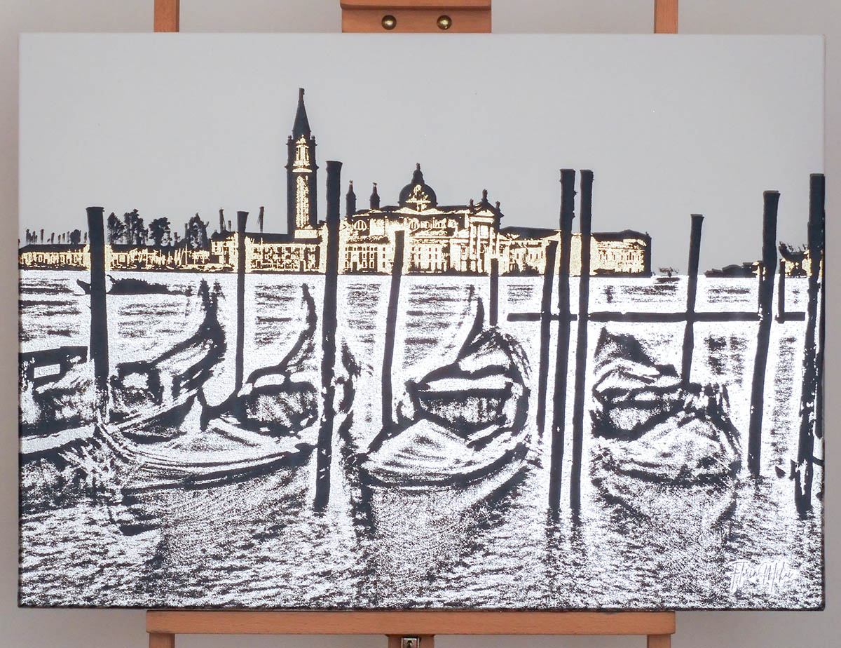 Executed using black ink, gold, and silver leaf on canvas stretched over a wooden chassis, the composition contrasts the soft shimmer of the water with the bold silhouettes of the gondolas and mooring poles.