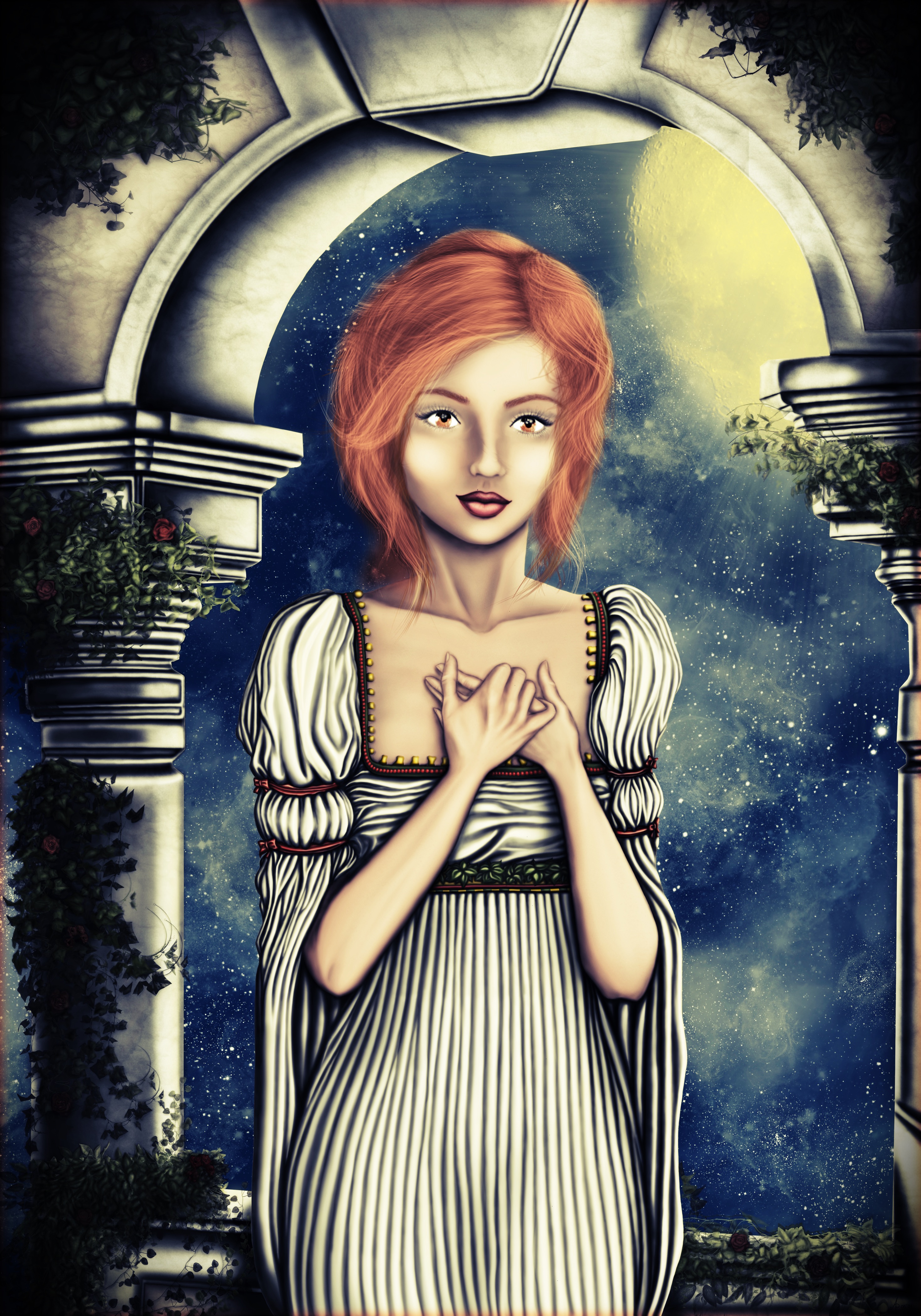 A White Magician is standing on the terrace of her sky palace in the moonlight, looking down on earth in peaceful harmony.